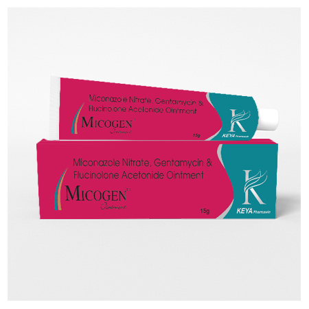 Use For: Micogen Ointment is a topical medication formulated to treat various skin infections. It combines three active ingredients: Miconazole Nitrate (2.0% w/w), an antifungal agent; Gentamicin (0.1% w/w), an antibiotic; and Fluocinolone Acetonide (0.01% w/w), a corticosteroid. This combination allows Micogen Ointment to address fungal and bacterial infections while reducing associated inflammation.